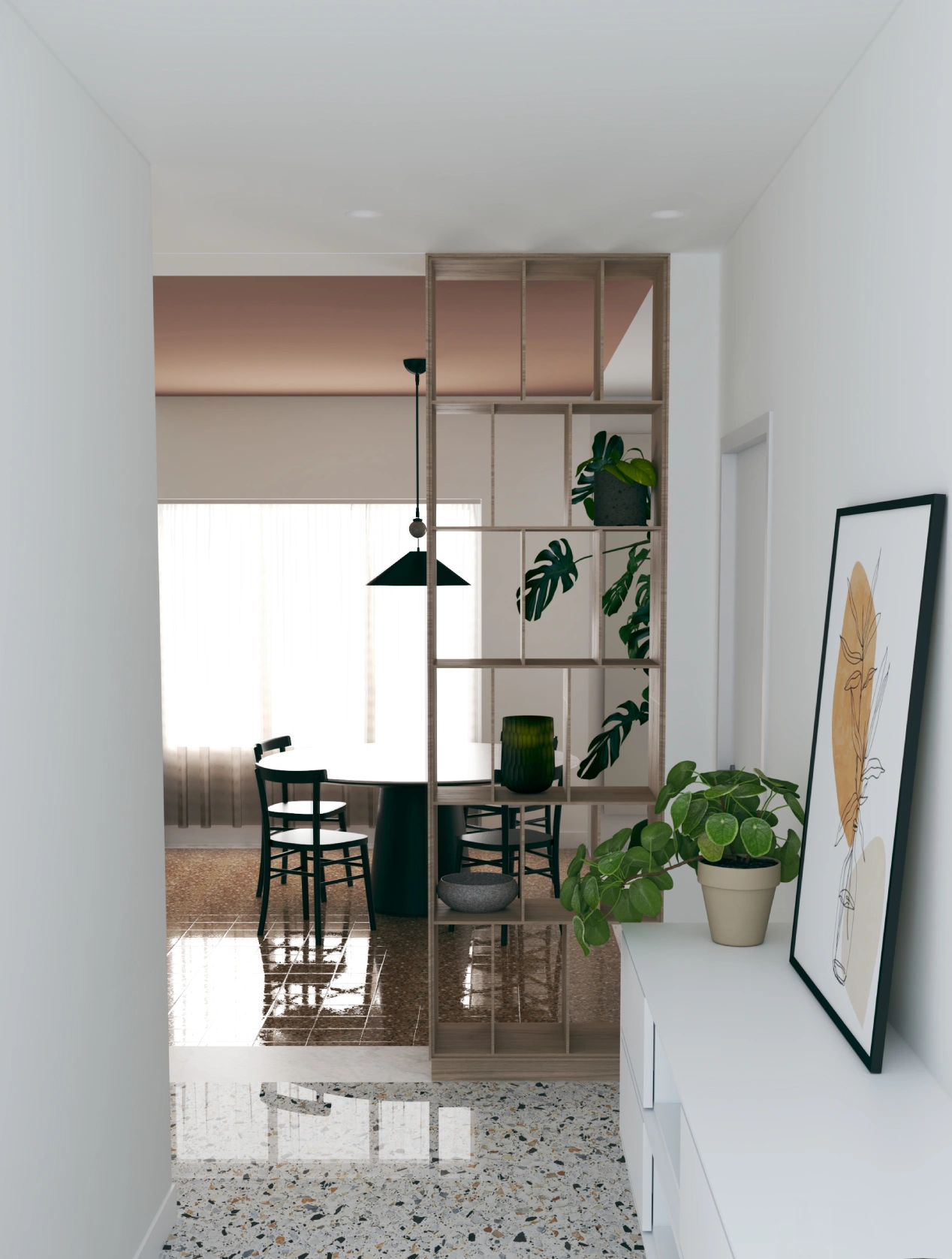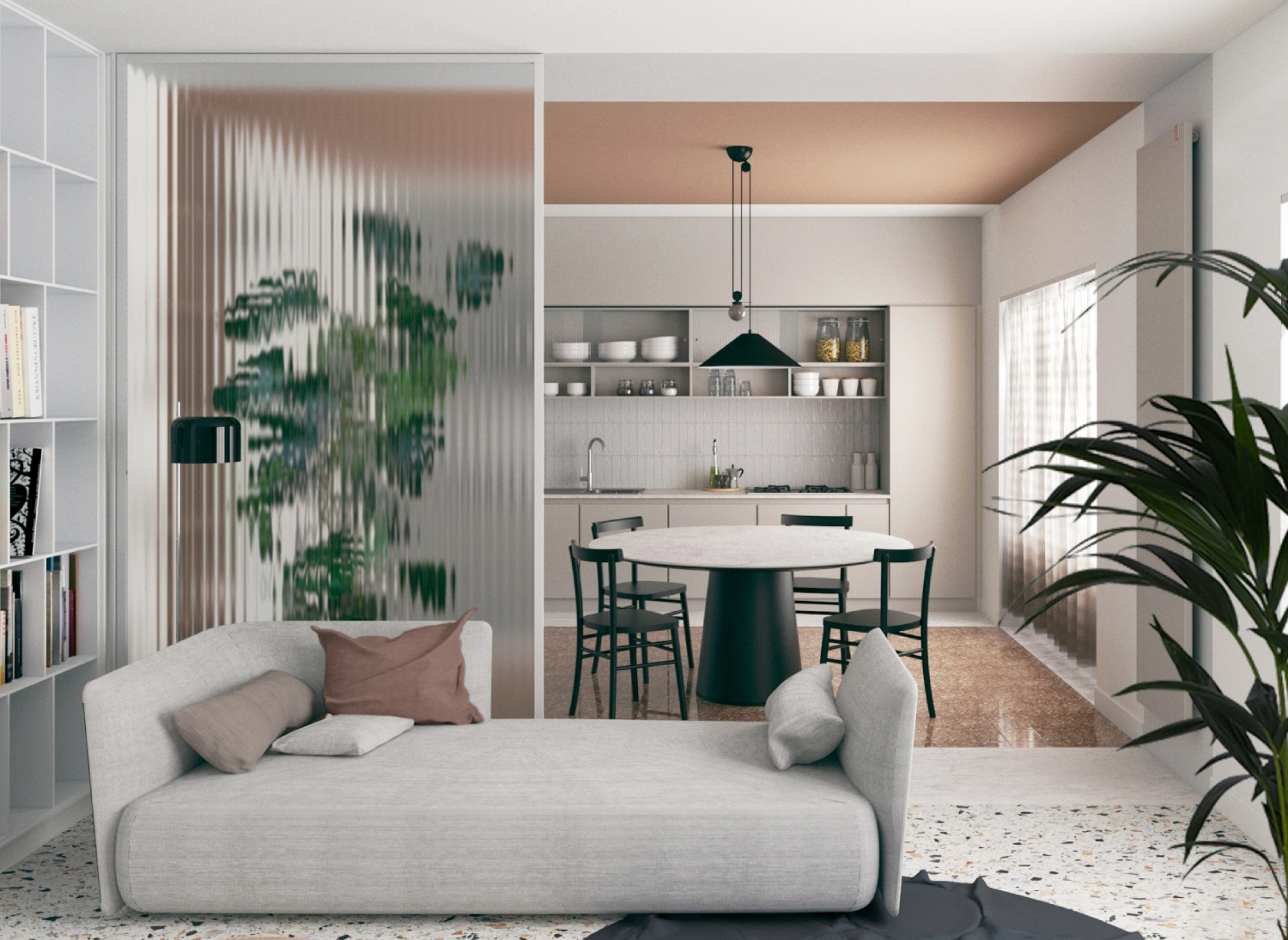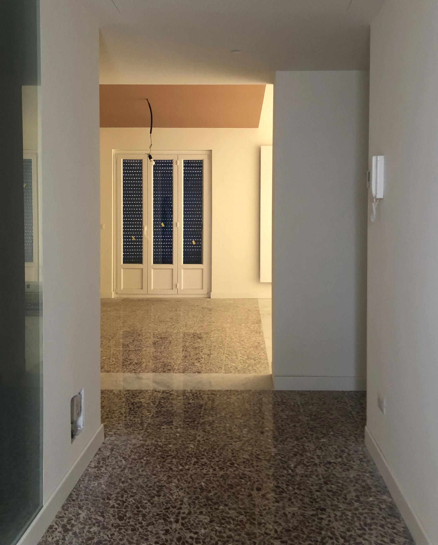 In its original configuration, the apartment had a typical distribution of the 50s - 60s, with a long corridor serving adjacent rooms and two large and uncomfortable service spaces. The client therefore asked for a better space distribution, with minimal interventions to keep costs low.The original flooring in marble chips, different in each room, was worn but in good condition. The design choice was therefore to maintain the old flooring, even where rooms were merged, with the flooring identifying colored boxes within the merged spaces, using the predominant color of the floor in the design of each new space.The distribution was reinterpreted and adapted to new models of life. The spaces respond to new rules, restoring previously unthinkable depths of perspective, articulated by the colors identifying different areas of use.