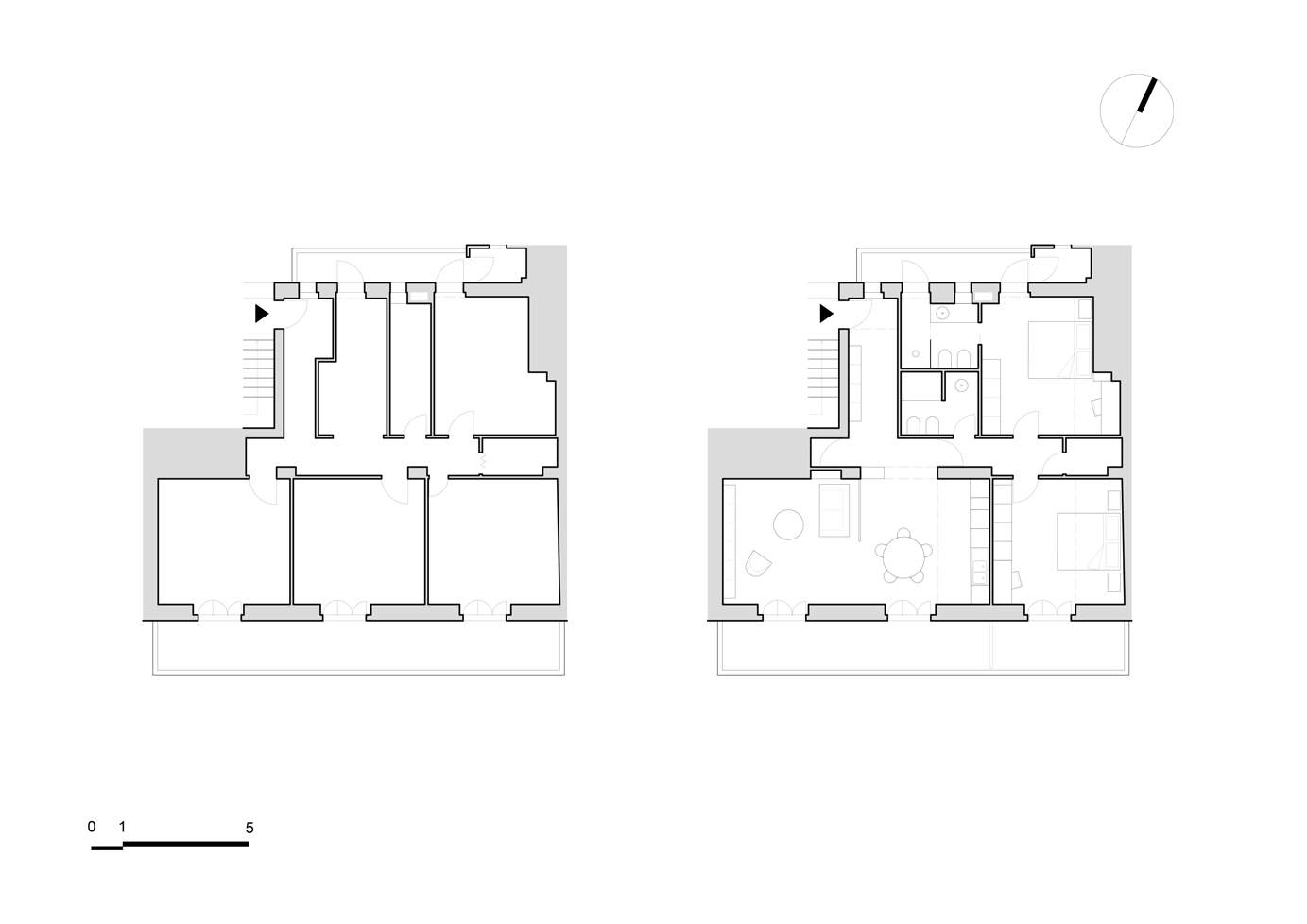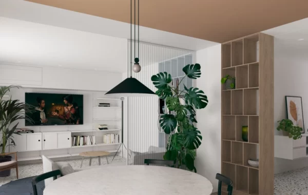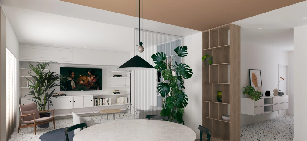 In its original configuration, the apartment had a typical distribution of the 50s - 60s, with a long corridor serving adjacent rooms and two large and uncomfortable service spaces. The client therefore asked for a better space distribution, with minimal interventions to keep costs low.The original flooring in marble chips, different in each room, was worn but in good condition. The design choice was therefore to maintain the old flooring, even where rooms were merged, with the flooring identifying colored boxes within the merged spaces, using the predominant color of the floor in the design of each new space.The distribution was reinterpreted and adapted to new models of life. The spaces respond to new rules, restoring previously unthinkable depths of perspective, articulated by the colors identifying different areas of use.