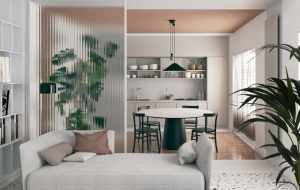 The bathrooms, one green and the other yellow, also use the colored-box logic as clear imaginary planes separate the colored from the white parts.The space becomes particularly interesting in the living area, which was created by fusing two different rooms, resulting in two imaginary boxes of different colors, mediated by a ribbed glass, echoing the age of the building, and separating the more intimate living space from the dining-kitchen area.