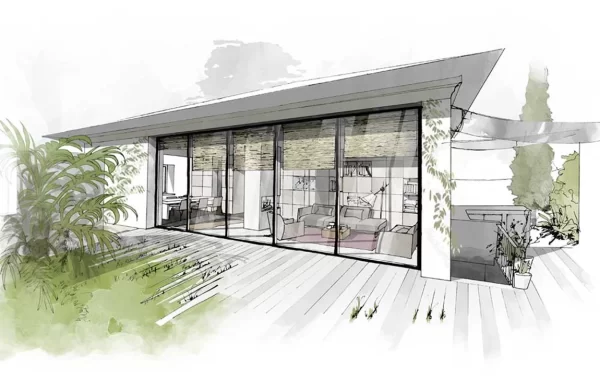 Despite the asymmetry of the lot, it was possible to find a uniform and definitive design. The perimeter of the pre-existing building was virtually transferred to the south limit of the property so as to obtain two intersected volumes: an indoor space which gives onto an enclosed and cosy outdoor space.