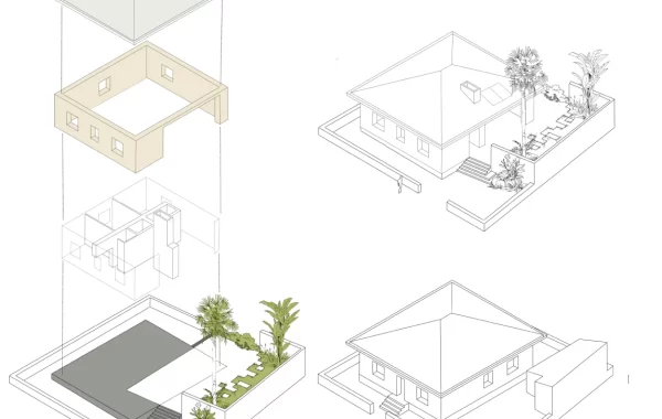 The customers’ request, of having a detached house with a garden, has strongly shaped the design proposal. In the preliminary phase the indoor spaces were disjointed and raised of 80 cm, from the garden level. These spaces were redesigned to give onto the outdoor space. Hence, the level of the front-yard (opposite the living area) was raised up to the same level of the indoors. The main entrance was moved from the street level front, where it was initially located, to the common ground between the house and the garden, in order to create complementarity between the indoor and outdoor spaces.