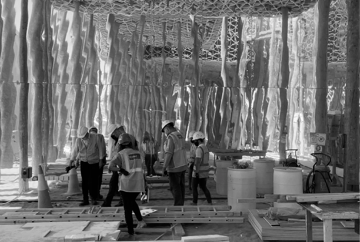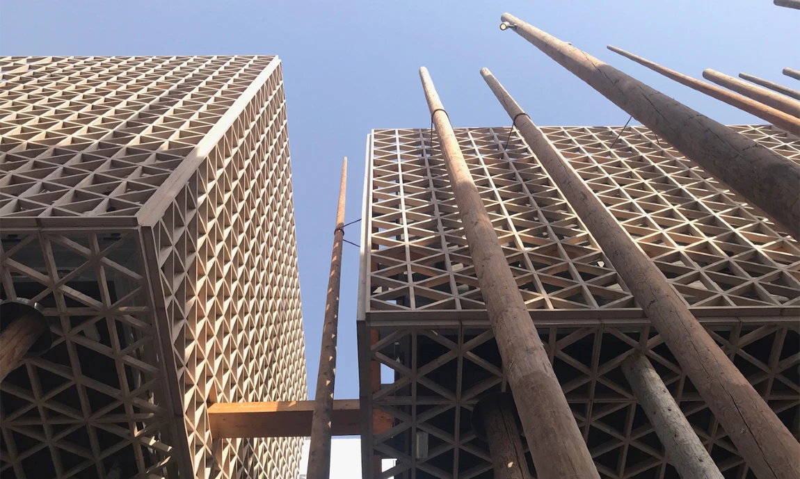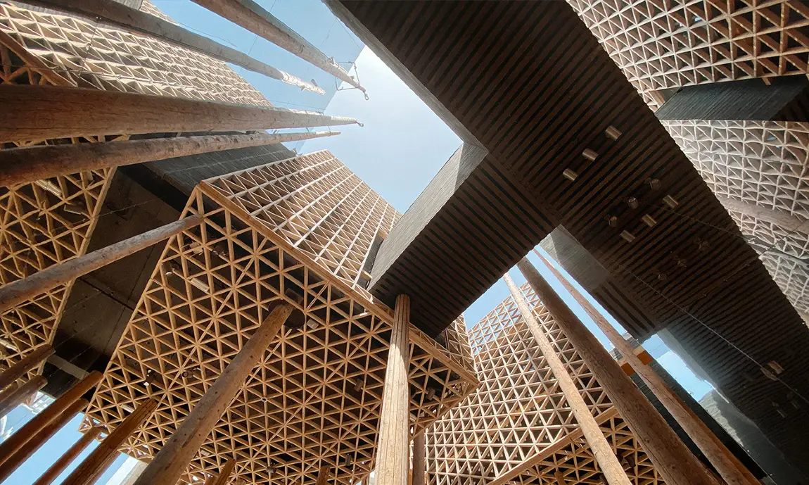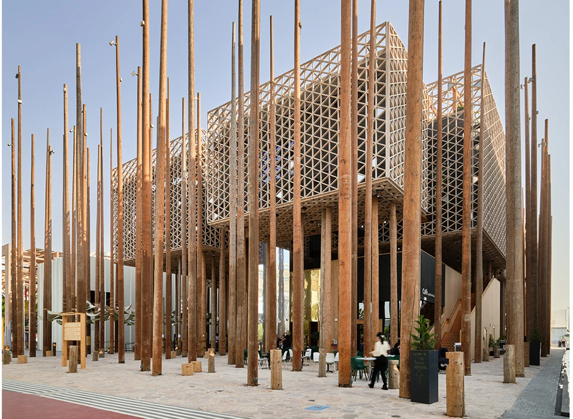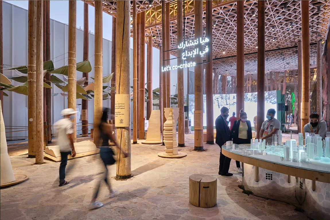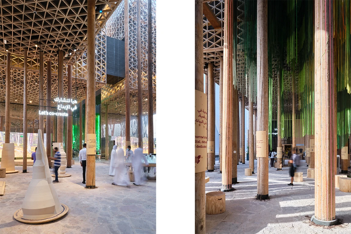 “L’essenza stessa della ‘foresta’ ispira il padiglione nella sua interezza, dalla sua sensibilità architettonica alla sua narrazione.Il concetto pervade lo spazio, formando una sensazione potente e coesiva. Bello e incantevole, è una fusione del fitto bosco nordico con il design geometrico islamico, unendo così le due culture”.