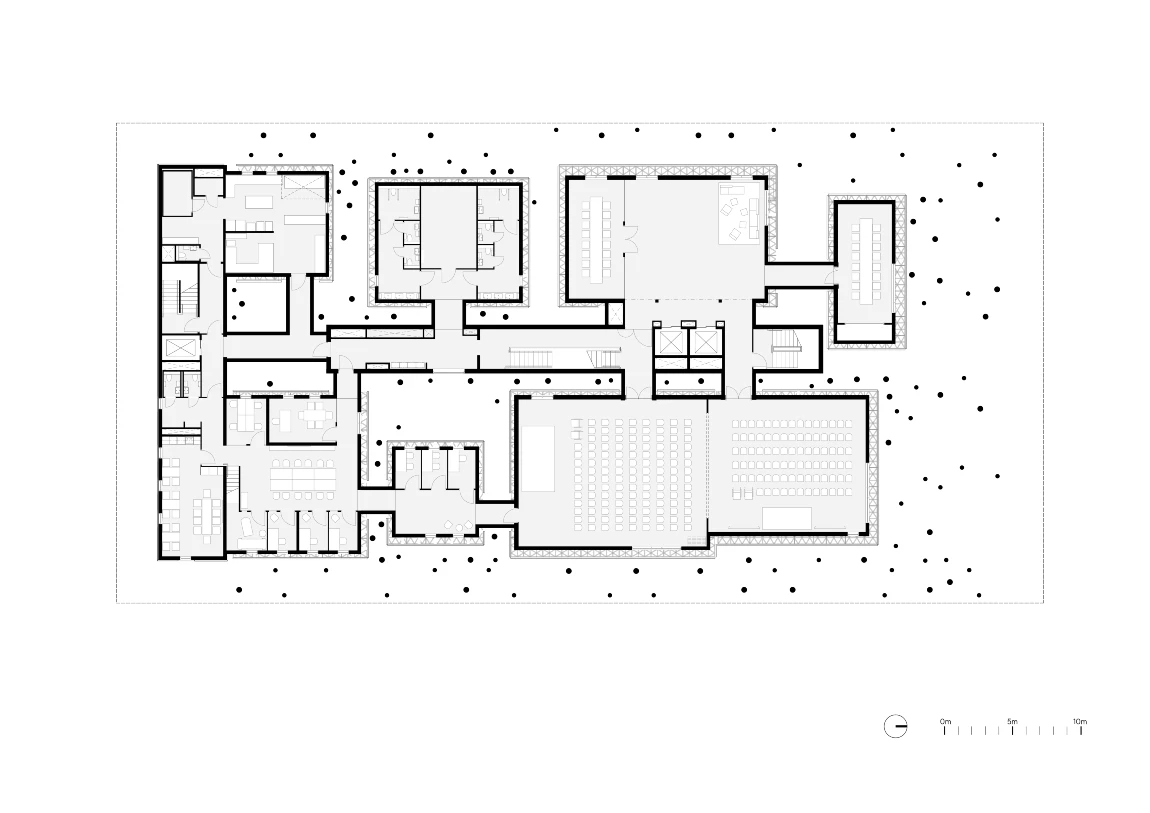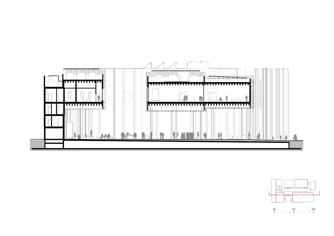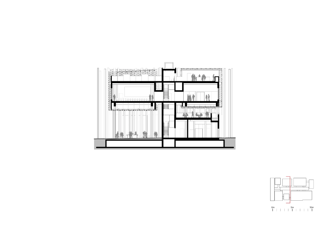 L’esterno dei volumi privati chiusi sono schermati da pannelli reticolari in legno dal disegno geometrico islamico, che consentono l’ombreggiatura dal sole.