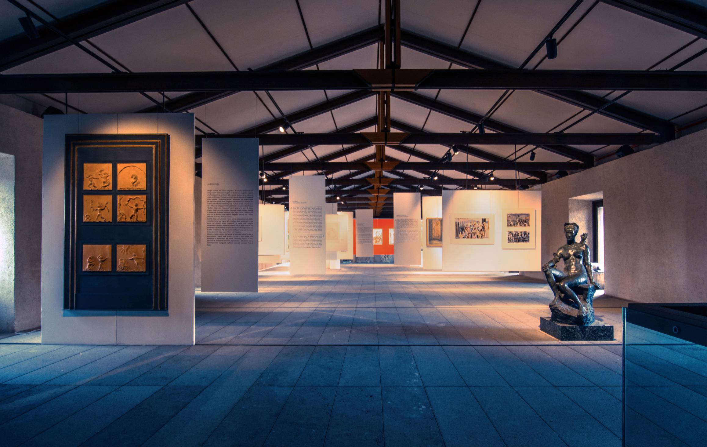 L’allestimento interpreta in chiave scenografica il caratteristico processo compositivo dell’artista. La disposizione delle opere in sequenza, prospetticamente sovrapposte e sospese secondo l’ordine: segno, materia, forma, ricostruisce l’atto creativo dell’artista.