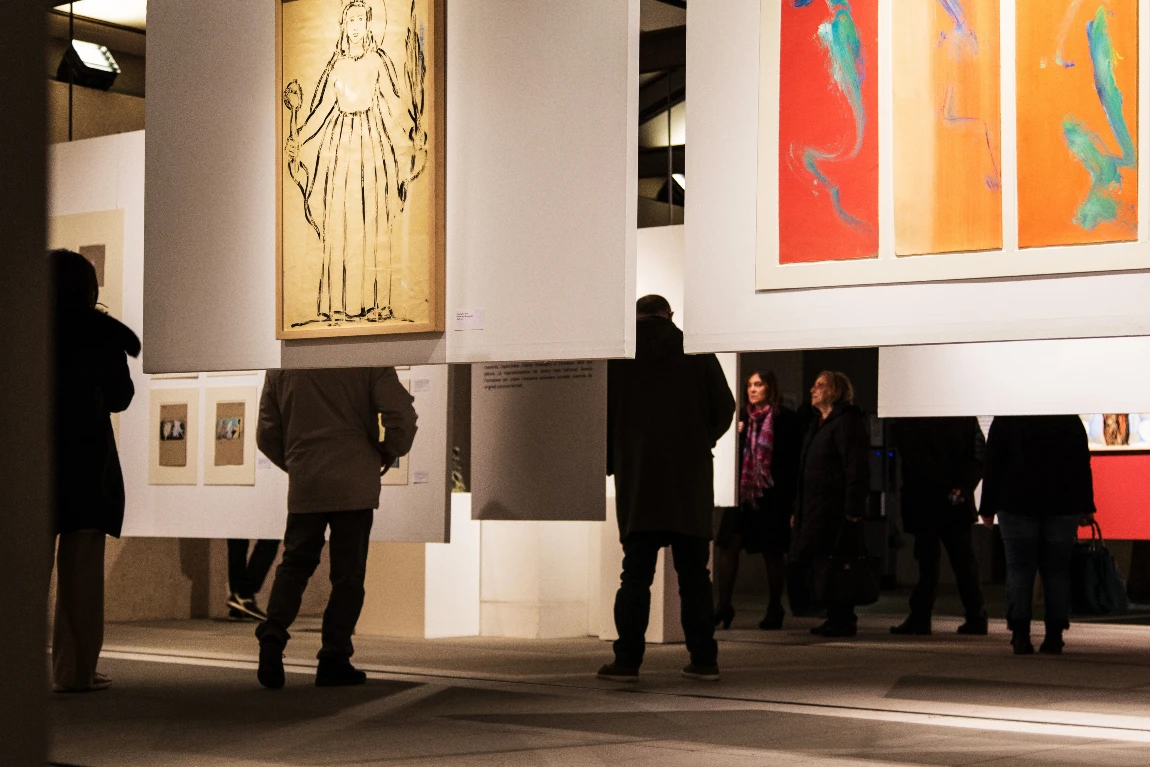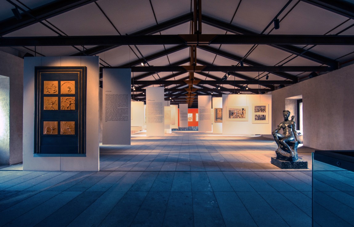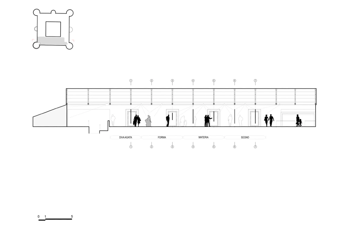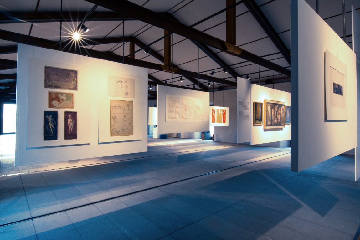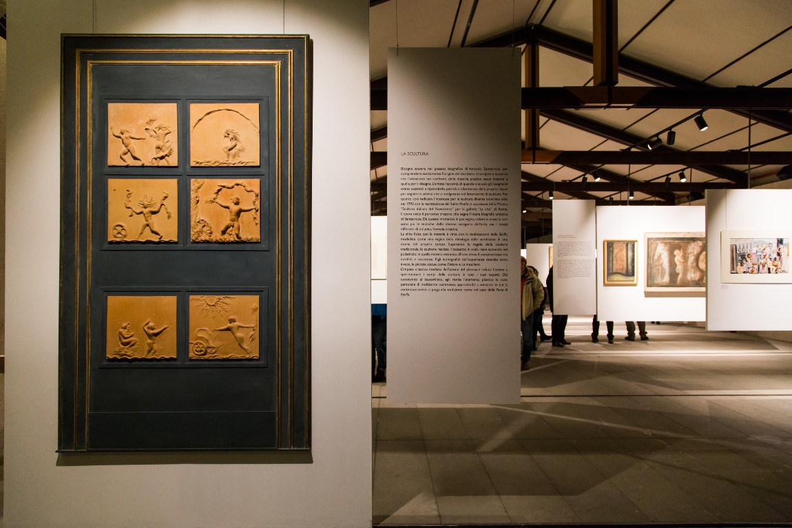 L’allestimento interpreta in chiave scenografica il caratteristico processo compositivo dell’artista. La disposizione delle opere in sequenza, prospetticamente sovrapposte e sospese secondo l’ordine: segno, materia, forma, ricostruisce l’atto creativo dell’artista.