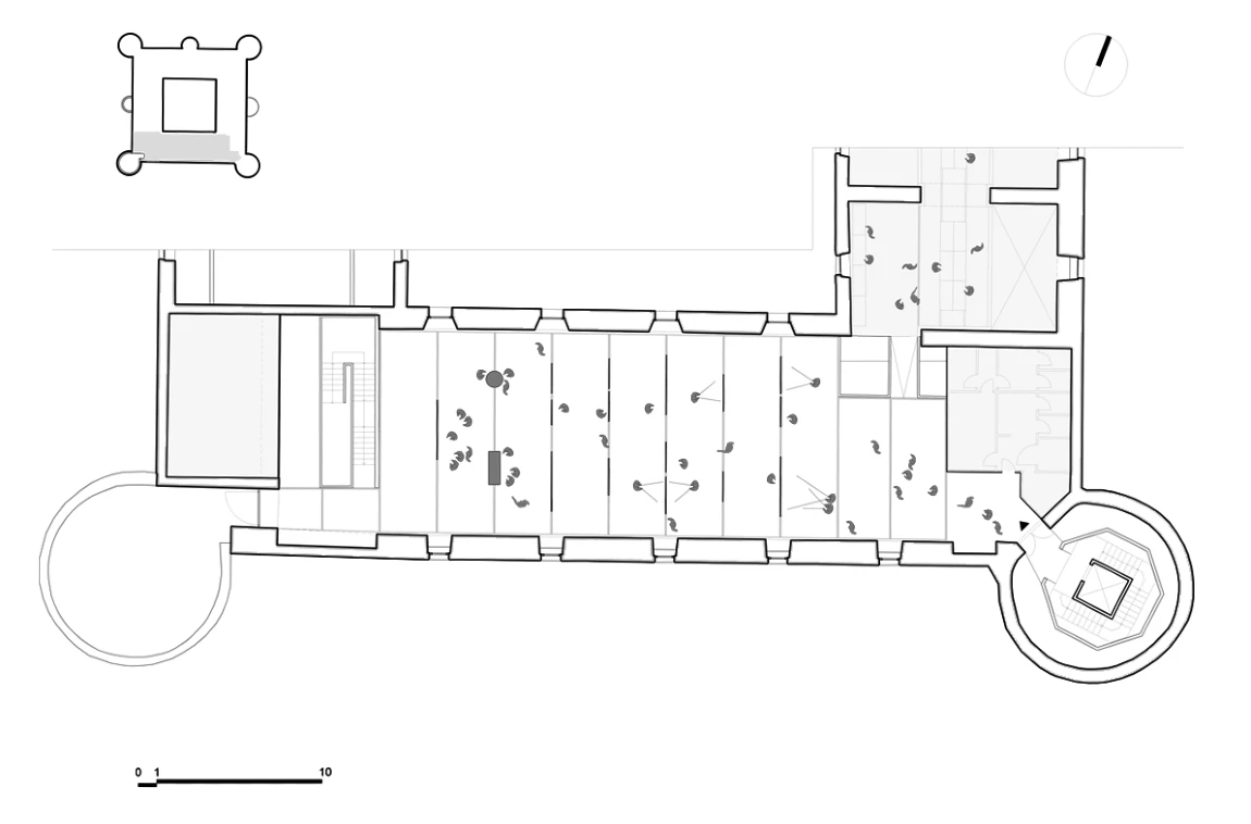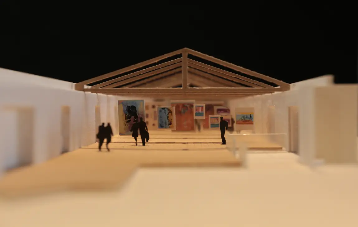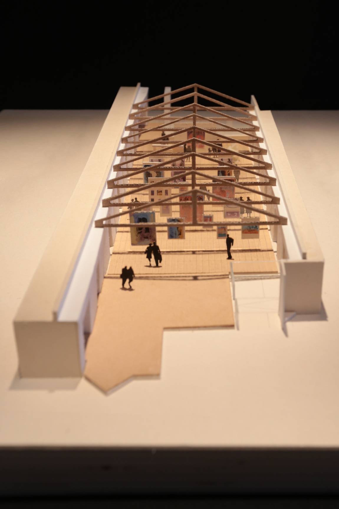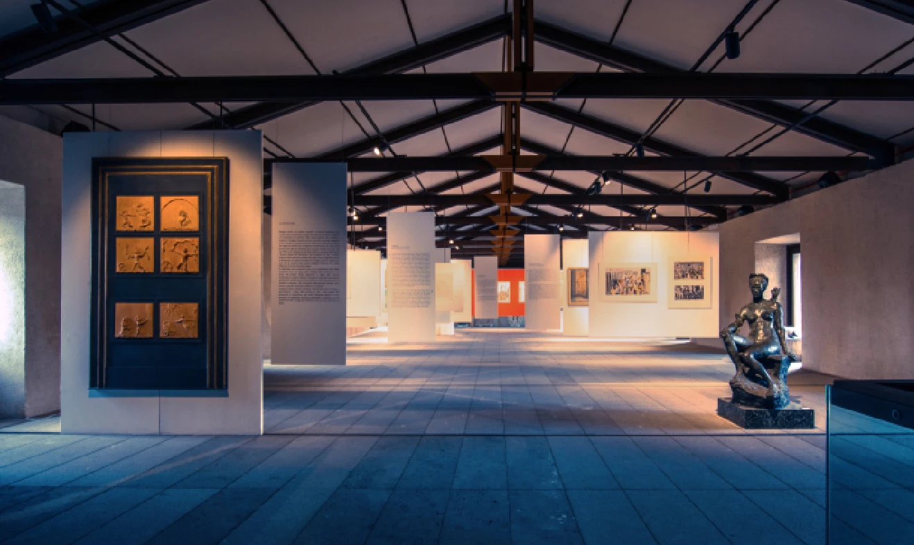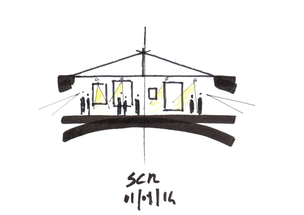 L’allestimento interpreta in chiave scenografica il caratteristico processo compositivo dell’artista. La disposizione delle opere in sequenza, prospetticamente sovrapposte e sospese secondo l’ordine: segno, materia, forma, ricostruisce l’atto creativo dell’artista.