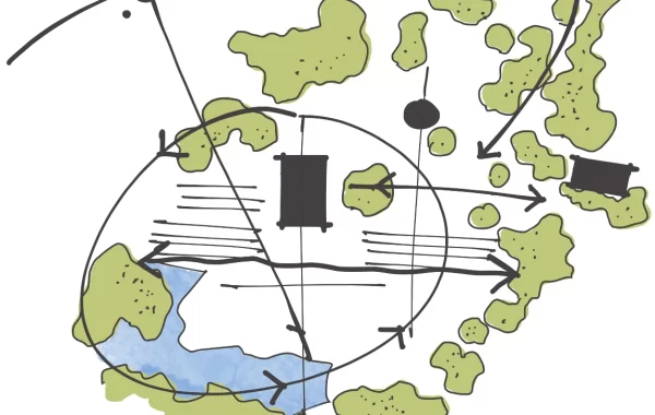 Il manufatto originario era una vecchia struttura abbandonata da tempo, sulla quale non avevamo modo di intervenire, pertanto l'intervento si è concentrato sugli spazi esterni, con l'inserimento di un biolago, e la gestione di percorsi e del verde, e sugli interni