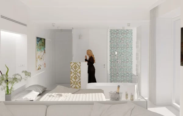 Il progetto degli interni si basa sul principio della contaminazione, infatti gli spazi sono stati immaginati completamente bianchi, all'interno dei quali alcuni angoli venivano rivestiti con antiche maioliche, ogni angolo con maioliche di colore e fantasia diversi, all'interno dei quali gli arredi, altrimenti bianchi, si contaminano, colorandosi, così il lavabo diventa giallo in corrispondenza delle maioliche gialle, lapoltrona blu in corrispondenza delle maioliche blu, e così via.