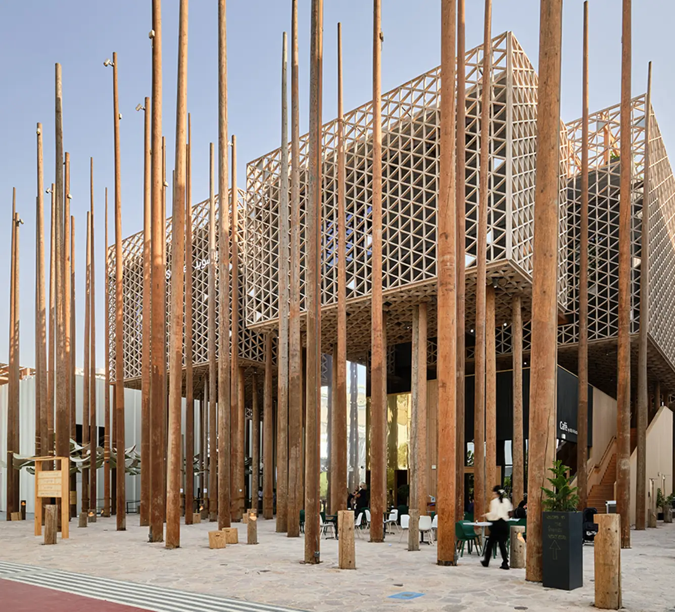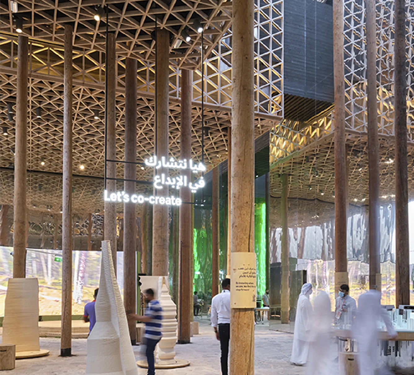 “L’essenza stessa della ‘foresta’ ispira il padiglione nella sua interezza, dalla sua sensibilità architettonica alla sua narrazione.Il concetto pervade lo spazio, formando una sensazione potente e coesiva. Bello e incantevole, è una fusione del fitto bosco nordico con il design geometrico islamico, unendo così le due culture”.